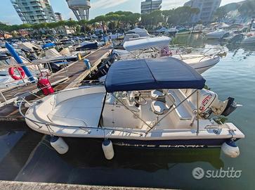 Barca a motore Kelt - White Shark 205 Anno 2001. Motore Evinrude 150cv 2 tempi. Carrello per trasporto compreso. Velocità massima 40 nodi. 800 ore di moto. Sempre regolarmente tagliandato presso concessionario Evinrude. Durante ogni inverno viene tenuta fuori dall'acqua. Strumento Geonav con ecoscandaglio. Doppio serbatoio da 130+110 litri (centro barca e poppa). Verricello elettrico per ancora. Frigo Igloo. Cavi ultraflex del 2014. Elica Viper del 2015. Cuscineria completa in perfetto stato. Telo copri-console centrale. Tavolino alzabile a prua. Sedili girevoli per pescare. Eventuale bagno chimico sotto console (rimosso e adibito a gavone), c'è ancora ma non viene tenuto sulla barca. Barca tenuta in ottime condizioni, contattatemi per ulteriori info.