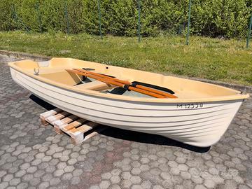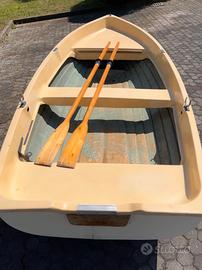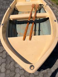Lancetta in vetroresina completa di scalmi e remi in legno, perfetto stato. Molto spaziosa, stabile e leggera. Misure 330 x 145. Possibilità di installare motore poiché presente sullo specchio di poppa robusto porta fuoribordo. Lungo tutta la lunghezza della chiglia è montato profilo in inox di protezione per possibile alaggio sulla riva. Per info chiamare no perditempo.