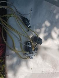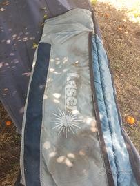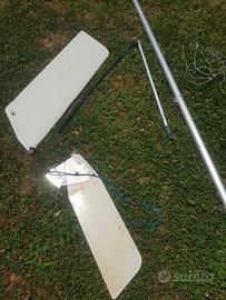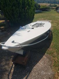 Armo moderno (vang, tesa base ecc), sacca timone e deriva, carrello di alaggio smontabile con ruote piene.