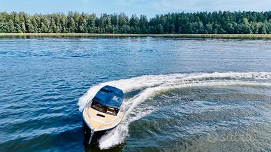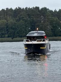 Un design moderno con la sua PRUA A PIOMBO, internamente molto comoda, un'ottima altezza di circa 2 mt dove troviamo doppio letto di prua più un terzo letto longitudinale, tavolo interno, bagno in locale separato, angolo cucina, pozzetto di ampia dimensione con divanetto ad U, grande prendisole di prua (prendisole sopra HARD top OPTIONAL).