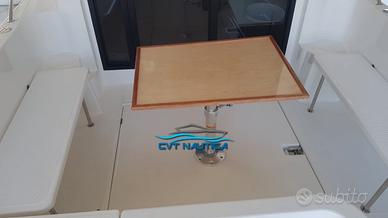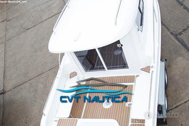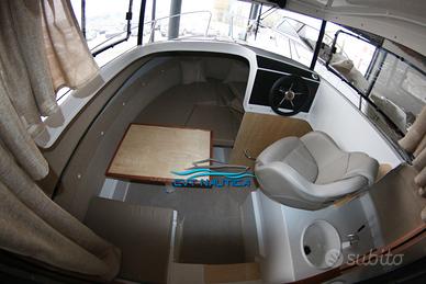 Ottima distribuzione degli spazzi con comodo prendisole di prua . Grande pozzetto con sedute abbatibili . Interni unici per imbarcazioni di questa categoria dove è possibile alloggiare un bagno marino anche con locale separato e ben 2 + 2 posti letto