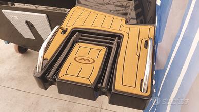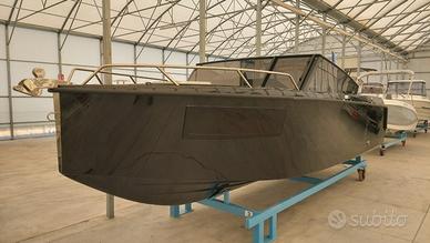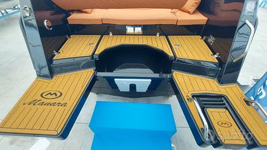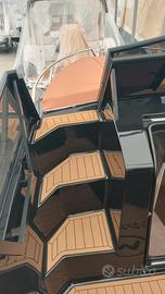 ACCESSORI compresi: Pompa di sentina automatica, Luci di navigazione, Pozzetto autosvuotante, Parabrezza Premium, Idroguida e Volante, 4 Bitte Premium a scomparsa, Tientibene in acciaio Inox, Panca guida per 2 persone con appoggiareni, Cuscineria interna cabina, Bagno in locale separato con WC elettrico, Scaletta bagno Inox, 2 plancette allungate di poppa, Divanetto di poppa con cuscineria completa, Schienale abbattibile che prolunga il prendisole, Consolle panca di guida con lavello, Predisposizione per cucina e frigorifero, Carena colorata nera, Coperta colorata black edition