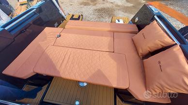 Tessuto luxuri silvertex diamante a rombi col. Terracotta, Tavolo esterno in legno con teak sintetico, Doccetta est. serbatoio 70 lt., Wc elettrico, Frigorifero 12v, Cuscino prendisole di prua, Teak sintetico nel pozzetto, Oblo' di prua, Tendalino in alluminio, Fornello vetroceramica a gas.