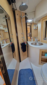 Cabina armatore a prua, cabina a centro barca con due letti singoli, bagno ospiti, bagno privato in seconda cabina, cucina a L, dinette a C.