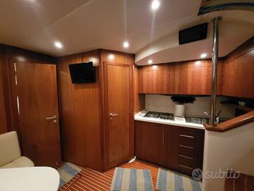 la barche è la versione con garage per tender posteriore, ha un ampia dinette dotata di ampio spazio living con cucina molto comoda e zona pranzo trasformabile a letto, bagno con vano doccia separato, poi c'è la cabina armatoriale a prua con cassetti e vani armadio, cabina di poppa con due letti separati e bagno piccolo in camera. Molto luminosa e soffitti molto alti