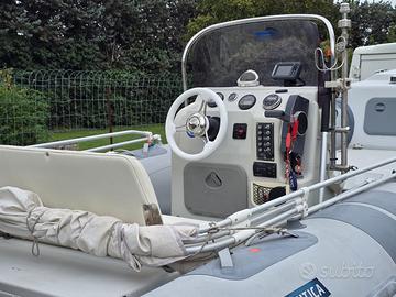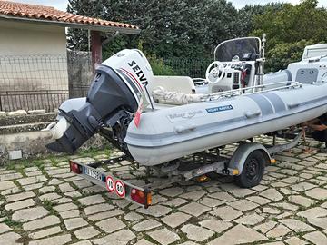 Gommone Mar Sea 100 in ottime condizioni, dotato di gps ed ecoscandaglio, dotazioni di bordo complete, tendalino, scaletta, strumentazione completa, portacanne, salpa ancora elettrico, musone di prua in vetroresina, radio boss marine, timoneria idraulica, tavolino, cuscineria come nuova, telo copri consolle, telo copri motore e telo copri gommone.