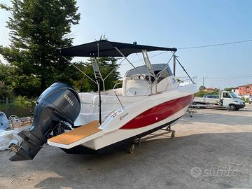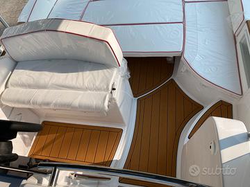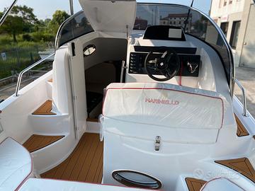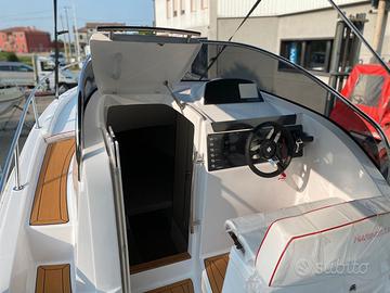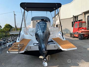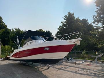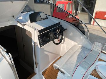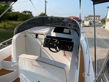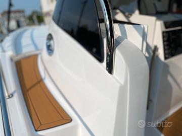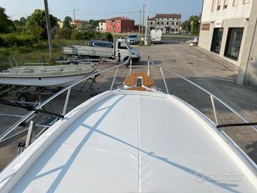 Questa barca cabinata di quasi 8 metri si presenta con la linea sportiva e grintosa, caratteristica che delinea tutti modelli del cantiere. E' molto piacevole guidarla, in mare o in laguna anche in condizioni meteo sfavorevoli per la navigazione. La posizione di guida è ottima rispetto al parabrezza garantendo un grande riparo da aria fredda o spruzzi d'acqua!
