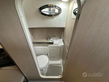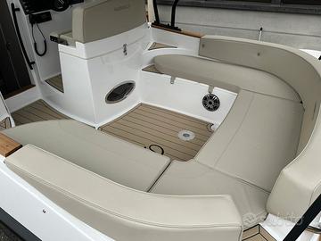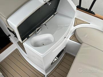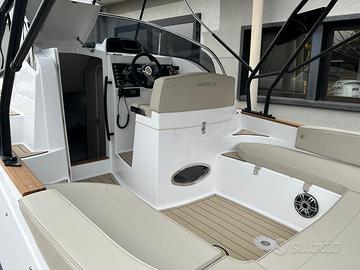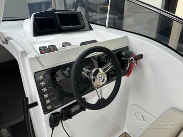 Questa barca cabinata di quasi 8 metri si presenta con la linea sportiva e grintosa, caratteristica che delinea tutti modelli del cantiere. E' molto piacevole guidarla, in mare o in laguna anche in condizioni meteo sfavorevoli per la navigazione. La posizione di guida è ottima rispetto al parabrezza garantendo un grande riparo da aria fredda o spruzzi d'acqua!