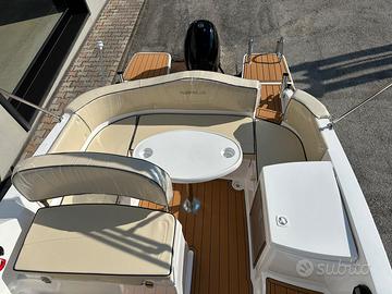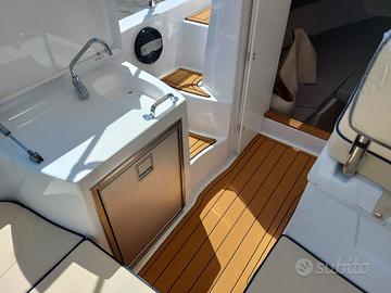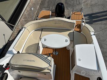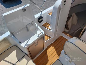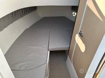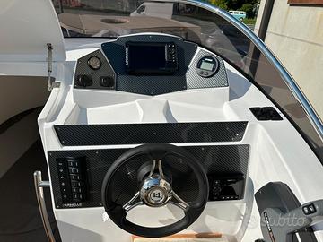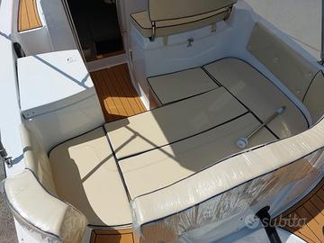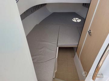 Questo semicabinato di 6 metri ha lo scafo omologato per 6 persone, si presenta con delle dimensioni generose, un ampio prendisole di prua, ampi spazi di passaggio e sopratutto una cabina dalle dimensioni notevoli che può ospitare comodamente 2/3 persone; inoltre verso prua è stato installato un oblò per arieggiare, insieme alla porta di ingresso, l'ambiente interno. Nella cabina è presente un locale bagno separato con all'interno, wc chimico o elettrico ( optional ) lavello e doccia interna, tutto in una barca di 6 metri!!