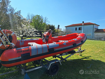 Vendo gommone Marshall prima serie m100, lunghezza 5,23 m, gommone di 40 anni ma ancora in buone condizioni. Serbatoio 30 litri, filtro decantatore, doppia pompa di sentina (una automatica e una manuale), bussola, luci di via, cuscineria di prua, telo di copertura e ecoscandaglio. I tubolari hanno delle riparazioni eseguite da officina specializzata. Motore Mercury 40 cv 4 tempi NO PATENTE anno 2001 in ottime condizioni. Possibilita di averlo anche immatricolato con bandiera slovena per navigare in Croazia senza problemi. Carrello stradale revisionato. Vendo a 5000 non trattabili. Senza carrello 4000 non trattabili. Solo gommone 2500. Solo motore 1500.