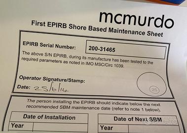 27. RIMINI. Vendo MCMURDO Smartfind NAUTICO 406MHz GP5 EPIRB pari al nuovo. Global 406MHz international search & rescue system. G5 Plus, 48 ore, GPS option. High intensity LED strobe light. Nuovo con scatola, con tutti documenti, con MMSI. La batteria è gia scaduta ma per comprare nuova potete seguire link che vi mando qua nel chat privato. Subito non mi da pubblicare. Per maggiori informazioni non esitate a contattarmi: 3513618903. No chiamate, scrivere su WhatsApp per favore.