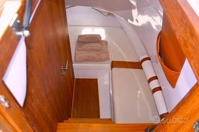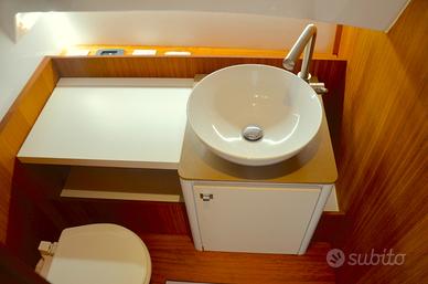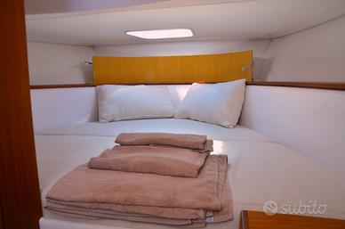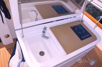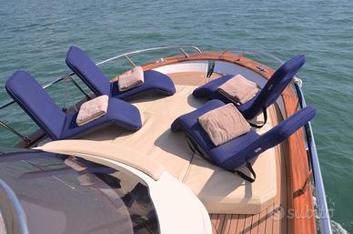 T-Top, inverter, elica di prua, cucina a induzione, frigo, lavandino, cuscineria completa trasformabile, cabina con letto matrimoniale, wc separato con porta, doccia, stereo, flaps elettronici, cuscineria pelle color beige.
