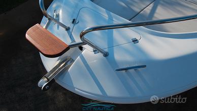 Consolle di guida con tientibene inox, parabrezza, volante, gavone portaoggetti e seduta anteriore;