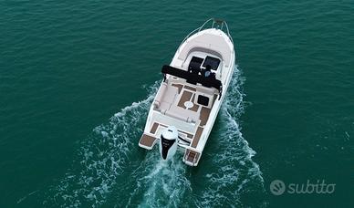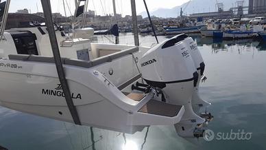 BARCA MINGOLLA BRAVA WA28 CON MOTORE HONDA MARINE BF250D WHITE CON CMANDI ELETTRONICI LUNHEZZA SCAFO M. 8,15 LARGA M. 2,75 Barca ideale per chi vuole trascorrere del tempo con la propria famiglia ed i propri amici godendo di ogni confort anche in mare. Un Walk Around che incarna il savoir-faire italiano nella costruzione navale e offre un’esperienza di navigazione incomparabile. Comodità e relax nel pozzetto grazie all’ampio divano ad “L”, riconfigurabile in un prendisole di poppa, piano di lavoro con lavello e piano cottura e sotto il sedile pilota, un prendisole a prua con schienale, La cabina ad altezza uomo permetterà di avere una zona relax e comodissimo letto a 2 posti con cuscineria di elevata finitura oltre al bagno separato completo di lavello e doccia. Tutto questo rende la BRAVA 28 WA la barca perfetta per tutti gli utilizzi in mare Consolle di guida con tientibene inox, parabrezza, volante e bussola; Luci di via e asta 360°; Impianto elettrico; Pannello interruttori; Timoneria idraulica; Serbatoio carburante 300 lt; Aspiratore fumi carburante; Panca di guida con lavello e piano cottura; Impianto doccia 80 lt; Bitte e golfari inox; Gavone a prua per ancora; Musone di prua inox; Porta estintore; Kit tavolo; Cuscineria completa cellula chiusa; Scaletta di risalita acciaio inox; Pompa sentina; Plancette di poppa. ROLL-BAR NERO IN ACCIAIO FINANZIAMENTI IN SEDE € 59.100,00+ IVA