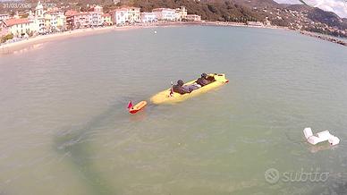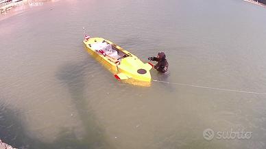 Vendo per dedicarmi ad altro progetto mini sommergibile a due posti "bagnato" (i due sub sono a contatto con l'acqua). Auto-costruzione in VTR e plastica. Il veicolo è dotato di due motori elettrici brushless da 800 W ciascuno, con elica intubata e protetta, tutta l'elettronica è in contenitori stagni. Sono presenti due pacchi batterie installati a bordo, uno principale e uno di emergenza. Predisposizione per 3 bombole da 15lt per le casse di assetto e la respirazione dei due sub, gli erogatori hanno manometri e frusta lunga. Tra le dotazioni fisse vi sono un Sonar anti-collisione anteriore, bussola, profondimetro, indicatore di carica batteria in uso, orizzonte artificiale ect. Dotato di carrello non stradale. Il veicolo è per uso ricreativo, progettato per lunghe esplorazioni subacquee in basso fondale (10 - 20 mt) o per trasferimenti brevi in superficie fino al punto di immersione (la permanenza è limitata dalle tabelle ovviamente). Potrebbe anche essere usato per portare in acqua persone con disabilità. I due sub dovrebbero avere in dotazione (non fornite) due bombole (5-10Lt) per maggiore sicurezza. Fornisco tutta la documentazione relativa alla costruzione e alla difficilissima corrispondenza con gli enti preposti per poterlo utilizzare. L'assicurazione annuale dei due motori costa circa 80 euro. ATTENZIONE: SOLO TRATTATIVA DI PERSONA, NON ACCETTO ALTRE MODALITÀ ANCHE PERCHÉ DEVO SPIEGARE IL FUNZIONAMENTO, LA MANUTENZIONE E FAR FIRMARE UNO SCARICO DI RESPONSABILITÀ ALL'EVENTUALE ACQUIRENTE. SE SIETE INTERESSATI VENITE, LO GUARDATE, LO PROVATE E POI NE PARLIAMO.