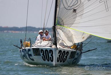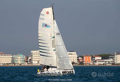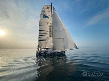Dotazioni vele = 2 rande, un frullo, due gennaker medi, due gennaker grandi, tormentina e randa da tempesta arancioni (manca il fiocco che si è strappato nell'ultima regata...).
