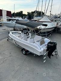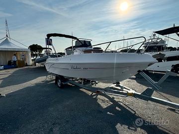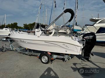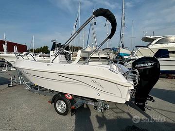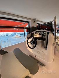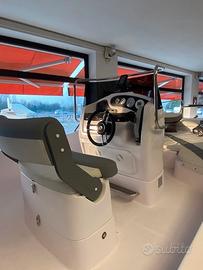 Musone a ribalta, cuscineria completa, tavolino, prolunga prendisole di prua, consolle ribaltabile, luci di navigazione, pompa di sentina, presa usb, serbatoio acqua con doccia, serbatoio benzina da 90 lt, scaletta bagno, volante con timoneria meccanica, 4 bitte, serie completa corrimano inox.