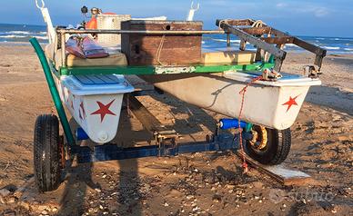 AFFARE!!! VENDO MOSCONE CON CARELLO ALAGGIO PREZZO AFFARE, per necessità di cambio barca più grande, lunga m 4,30 e larga 1,30 in buono stato compreso di carrello alaggio motorizzato a motore vespa 125 a 2 tempi con trazione anteriore a catena in acciaio inox e carrello rinforzo in acciaio inox e pitturato sulle traverse con vernice bicomponente marina con rulli e assi guida gommati nuovi. Gli accessori comprendono: Sostituiti i tappi integri di scolo, installati i teak sintetici antiscivolo sulle 4 punte estreme, scaletta in acciaio inox incorporata, poggia oggetti in acciaio inox, cuscineria in pelle sintetica resistente, coppia di scalmi, remi, salvagente e ancora. Non compreso pannelli fotovoltaici e motore elettrico. Prezzo veramente affare ? 500 compreso di tutto.
