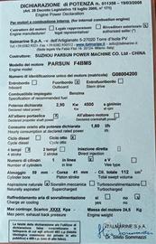 Vendo motore fuoribordo Parsun modello F4BMS, motore a 4 tempi affidabile, dai consumi estremamente contenuti e silenzioso. Il motore è ideale per tender, piccole imbarcazioni da pesca o come motore ausiliario.Il motore è completo di Certificato di Potenza originale (documento indispensabile per la circolazione in Italia e per l'assicurazione). Specifiche Tecniche (da documento):Modello: Parsun F4BMS (Gambo corto) Potenza: 2,90 kW (circa 4 CV) a 4500 giri/min Cilindrata: 112 cm3 Alimentazione: Benzina Ciclo: Otto - 4 tempi (non serve fare miscela) Peso: Solo 24,5 kg (molto facile da trasportare a mano) Consumo orario: Solo 1,60 litri/ora alla massima potenza Configurazione: Monocilindrico, raffreddato ad acqua Stato e Accessori:Manuale d'uso originale incluso. Documentazione fiscale/tecnica in regola. Nuovo
