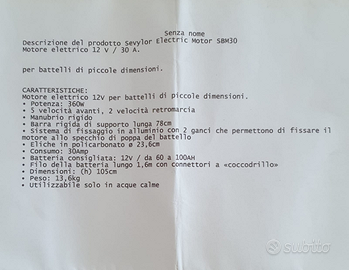 Motore elettrico Sevylor SBM30, 12 V / 30 A, 5 velocità avanti, 2 velocità in retromarcia, per battelli di piccole dimensioni, utilizzabile solo in acque clme, nuovo mai usato, compresa batteria in AGM da 60 HA, anch'essa nuova