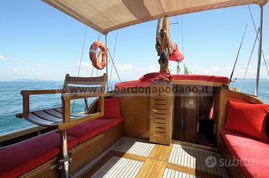 "A prua nel cala vele cuccetta e wc marinaio. Cabina di prua: scendendo dal pozzetto 3 gradini a destra cucina con 2 fuochi e lavello acciaio tutto a scomparsa difronte il bagno con wc mobiletto lavabo e paiolo a terra per fare la doccia poi andando verso prua un tavolo pieghevole con 2 panche/letto con gli schienali imbottiti che si alzano si sospendono a delle cinghie trasformandosi in 2 letti a castello.