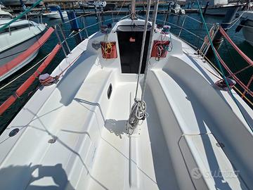 L'armo velico è semplice ma efficace, composto da una randa semi steccata con lazy bag e fiocco con avvolgitore. A completare l'assetto, un pratico gennaker originale. Il sartiame è in tondino, originale e ben tenuto. In pozzetto troviamo 4 winch manuali (marca Nautico, modello 8), regolarmente manutenzionati, con tutte le drizze rinviate, rendendo la barca facilmente gestibile anche in equipaggio ridotto.