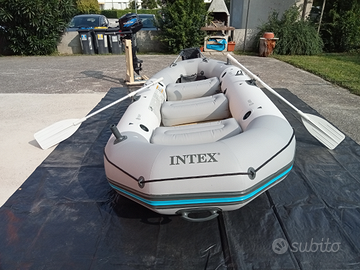 Gommone Intex Mariner4 come nuovo usato una sola volta, completo di cuscini sacche e pompa manuale. Regalo porta motore pompa elettrica a batteria con cavi di collegamento a batteria, scaletta a pioli borsone x trasporto.