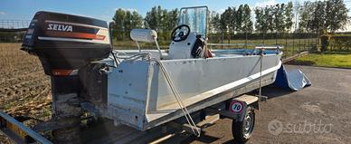 Vendo imbarcazione in alluminio nautico a chiglia piatta lunghezza 5 MT. Modello con sponda alta; monta motore a gambo lungo SELVA MASTER 40 CV completo di libretto. In dotazione telo di copertura e carrello stradale (portata 800 kg complessivi) vendibile anche separatamente.