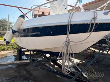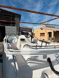Italmar Open 19 Dati tecnici principali: Lunghezza: 5,90 m Larghezza: 2,20 m Sponde alte Peso senza motore: 500 kg Materiale scafo: VTR Motore: fuoribordo honda 40/70 pari al nuovo Portata: 7 persone Categoria di navigazione: C - Certificazione CE Dotazioni: Timoneria monocavo, parabrezza plexiglass, pulpito acciaio, 4 bitte in acciaio, ganci alaggio, luci di navigazione, cuscineria completa in stato sufficiente,pompa di sentina, doccia, serbatoio carburante , stacca batterie con 2 batterie,pannello interruttori, consolle guida centrale con tientibene inox, tasche laterali portaoggetti, scaletta di risalita inox, tendalino grandissimo, ecoscandaglio. Eccellente stabilita anche con mare agitato, la vendo a malincuore per passare ad altra categoria.