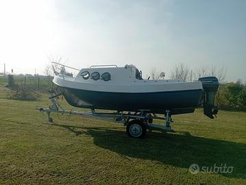 Barca da pesca o x famiglia,pilotina da 5mt riverniciata completamante, giubbotti salvataggio, kit 3 miglia, luci di via, ecoscandaglio,pompa di sentina, 1 serbatoio fisso + 1 amovibile da 22lt, ancora, mezzomarinaio, motore Johnson GT 737 25/40 trim elettroidraulico con libretto+ motore ausiliario 5cv con libretto+ 1 x ricambi, carrello LBN 650 da kg860ptt,basculante,cerchi in lega,gommato+ gommino di scorta,appena revisionato,con pedana antiscivolo, verricello elettrico a 3 velocità, sostituiti boccole timone, pistone repulsore, ceppi ganasce, luci ingombro.