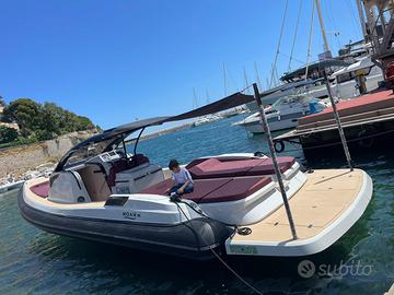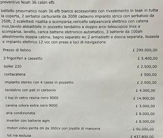 2 frigo a pozzetto all esterno 1 ghiacciaia all interno aria condiziona inverter per 220 a bordo tendalino a pali in carbonio boiler acqua calda ecc ecc prezzo di listino 437.000 più iva N.s. Prezzo demo 277.600 più iva