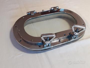 Vendo un oblò dalla forma allungata in metallo cromato con due chiusure a farfalla