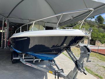 Open Tecnofiber Almar 170 5,40 mt, motore Evinrude E-tec 40/60 ad iniezione, bassi consumi, impianto stereo, luci di via, impianto elettrico doppia batteria con commutatore, serbatoio 25lt, tendalino, cuscineria completa pari al nuovo, 4 porta canna regolabili in acciaio inox, Ecoscandaglio, bussola, borsone nautico, copri barca, completa di carrello non omologato, acciaio inox, quello nelle prime foto non è mio. Perfetta in tutto, le foto parlano da sole. Prezzo leggermente trattabile.