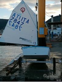 OPTIMIST BLUE BLUE ITA 7847 in buone condizioni. barca completa con salsicciotti, cima di traino, sassole, timone, deriva,vela, albero, picco, boma,. Carrello alaggio e telo imbottito. Visibile su appuntamento il fine settimana.