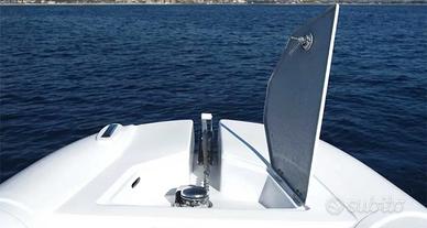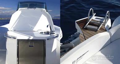 Autoclave completa, Bitte n.4 a scomparsa, Bussola alta velocità, Cuscineria personalizzabile, Doccia esterna a poppa, Impianto elettrico, Indicatore livello carburante, Lavandino con rubinetto, Luci di fonda a 360°, Luci di navigazione, Pannello interruttori, Parabrezza in plexiglass, Piano cottura a gas, Pompa di sentina a immersione, Scaletta risalita a scomparsa, Staccabatteria, Tavolo di poppa convertibile a prendisole, Tendalino parasole, Tromba a incasso, Volante.