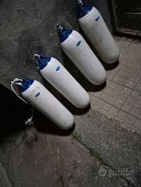 Vendo 4 parabordi cilindrici bianchi con calotta blu, ideali per barche e gommoni. I parabordi sono in ottime condizioni, completi di cime per il fissaggio e pronti all'uso. * Modello: Tipo Majoni / Polyform (corpo in PVC rinforzato). * Stato: Usati ma perfettamente integri, tengono bene la pressione. * Prezzo: 15€ cadauno. Disponibili per il ritiro a mano a Catania.