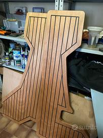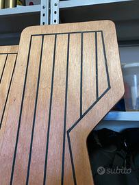 Vedo pedana di poppa in multistrato marino con ultimo strato in legno nobile okumè. Spessore 3cm, resinato e impermeabilizzato sul fondo. Realizzata per Clubman '24 con doppia motorizzazione no bracket con la scenda seduta a poppa "vedi foto".
