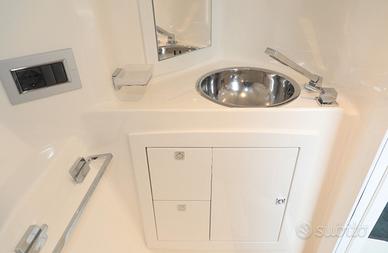 Dispone di una cabina confortevole con bagno separato e colpisce soprattutto per la sua incredibile dinamica di guida: con una struttura dello scafo estremamente elaborata, due motori e fino a 1.130 CV, ci si avvicina molto al sogno di volare.