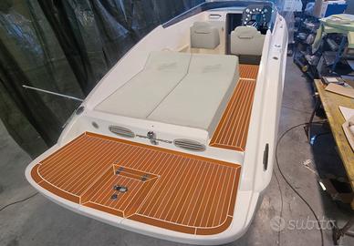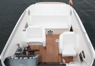 Design esterno verniciato · Boccaporto e oblò · Sedili offshore · Ampia zona prendisole a poppa · Portabicchieri · Tavolo pozzetto · Vano laterale per bottiglie · Luci pozzetto · Impianto stereo Fusion · Tappeto pozzetto · Piattaforma da bagno extra large in teak · LED sulla piattaforma da bagno · Scaletta da bagno in acciaio inox · Doccia di poppa · Maniglie di cortesia · Luci RGB · Passaggio laterale dalla piattaforma da bagno ·