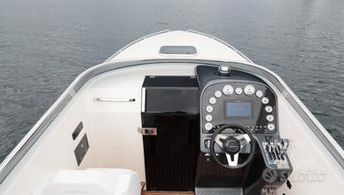 Verricello elettrico telecomandato · Ancora e catena in acciaio inox · Contatore catena di ancoraggio · Luci di navigazione · Parabrezza Lexan monopezzo · Telaio parabrezza, ringhiera e bitte in acciaio inox · Doccia di poppa · Ringhiera di poppa · Pompe di sentina elettriche ·