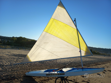 leggera, stabile, facilissima da armare e da condurre con vento forte e leggero. perfetta sia per principianti che per esperti. comodo ed economico il rimessaggio anche su rastrelliera è un singolo, ma con volume e spazio sufficiente per portare altre due persone. visibile a Vasto, qualsiasi prova. per altre foto o info lascio il telefono. lunghezza 4,13, larghezza 1,17, peso 60 kg albero divisibile, superficie velica 7,00 mq.