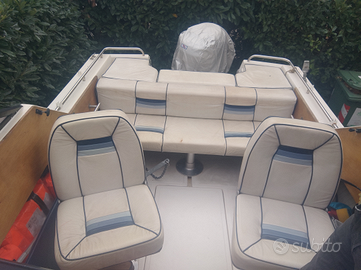 Pilotina mod Hellas Paradise motore fb 90 CV 4T , serbatoio plastica da 75 lt benzina, antivetativa fatta giugno 2025, barca in acqua solo due mesi estivi, telo copri barca invernale, tendalino mare e tendalino campeggio, pompa sentina , doccetta esterna , luci di via, scaletta , supporto per motore ausiliario, ancora con 10 MT catena, 2 casse acustiche, predisposizione VHF, wc chimico, ecoscandaglio, divanetto di poppa, due poltrone (una attualmente sostituita da sgabello per maggior spazio in pozzetto), oblò nuovo, cuscineria interna esterna originale in buono stato, due portacanne, barca pronta a navigare. Carrello anno 2019 ellebi 1300 kg revisionato giugno 2025 compreso nel prezzo. ideale per uscite in giornata o per pesca. Prezzo trattabile da concordare dopo visione. Vendo per passaggio a barca piu grande.