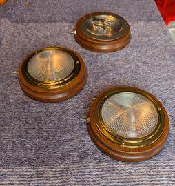 tre plafoniere in legno massello e ottone rotonde. 12 volt. da interno per barca diametro 15 cm. Nuove nella confezione originale.