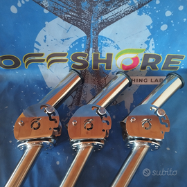 Portacanna per barca realizzato in inox AISI 316l lucidato a specchio,regolabile in 5 posizioni verticali scorrevoli e girevole sul piano orizzontale a 360 gradi tramite un pistone a sgancio rapido per trovare in una delle 12 posizioni l 'assetto migliore durante l'azione di pesca.