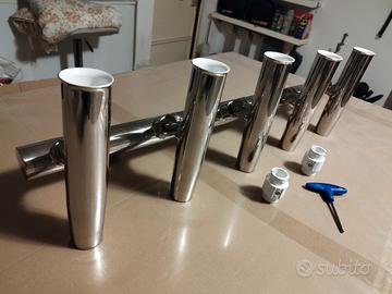 Solidissimo porta canne regolabile da riposo, 5 tubi regolabili in modo indipendente in acciaio inossidabile INOX AISI 316L lucidato a specchio.