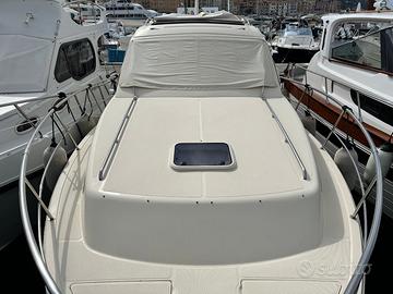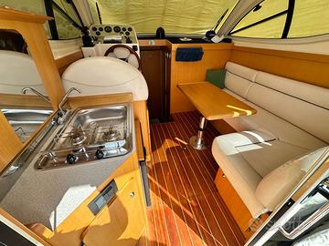 DETTAGLI TECNICI • Anno costr./imm.: 2012 • Lung x Largh. f.t.: 8,5 x 3,04 m. • Dislocamento: 4400 Kg. • Pescaggio: — m. • Motori: 2 x 210 hp • Ore di moto: 665 ca • Trasmissione: piedi poppieri Volvo DP • Cap. Serb.Carburante: 1 x 300 l. • Cap. Serb.Acqua: 1 x 200 l. • Velocità max/crociera: 29/24 nodi • Posti letto: 4 • Bagni: 1 DESCRIZIONE Un natante molto ben tenuto che offre 4 comodi posti letto ed una toilette. Condizioni ottime, ben accessoriata e pronta a navigare, possibilità di subentrare nella locazione del posto barca in cui staziona a Porto Santo Stefano. DESCRIZIONE DEGLI INTERNI Ampio pozzetto con tavolo e sedute perimetrali, ampio prendisole a prua. Dinette con tavolo e divano, porta in acciaio, cucina sul lato sinistro, frigo. Cabina con letti a castello a centro barca lato sinistro chiusa con tendina. Cabina padronale a prua con letto a V Toilette sul lato destro. STRUMENTAZIONE GPS Geonav, Vhf Raymarine, caricabatterie Victron DOTAZIONE ARMAMENTO Elica di prua, manette elettroniche ZF, hard top apribile, cucinetta interna a gas, passerella elettroidraulica, bolier, verricello elettrico con comandi a piede. nostre provvigioni del 5%+ iva Incarico di vendita esclusivo Barca in mare pronta a navigare