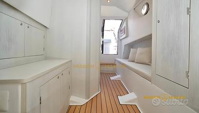 Il tavolo elettroidraulico scompare nel pavimento cosi' da formare un divano ampio e comodo per i passeggeri durante la navigazione,una soluzione Walk Around a tutti gli effetti con una bellissima consolle centrale che sottoseduta ospita fornello,lavello e frigo. E' davvero tutto da scoprire ha una cabina spettacolare e comodissima ,ma sopratutto altezza uomo ,vanta di un divano interno all'entrata sulla sinitra che si trasforma all'occorrenza in letto singolo , vari oblò per riciclo di aria in cabina , mobiletti e piccolo armadio per vestiario , letto matrimoniale ampio e spazioso per ospitare comodamente due persone.