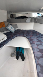 Questa barca è ottima per una coppia, ha una grande cabina molto accogliente e luminosa e il passaggio avanti della categoria walk around risulta facile grazie al sicuro e comodo passaggio a lato della consolle. Praticamente questa barca è un semicabinato con gli spazi di un bell open. Il tendalino di copertura è nuovo, una stagione di vita. ed è anche presente una tenda su misura occhiellata con dei moschettoni per allungare il tendalino fino a prua e coprire la zona del prendisole di prua dove può ospitare comodamente due persone. La resina, anche nel prendisole è una struttura bella resistente ed e una barca con un ottima solidità costruttiva. Semplicissima da governare con ampi gavoni, nel pozzetto si può mangiare con un bel tavolino comodamente in 2-3 Persone e all occorrenza anche in 4. Le consolle e le curve sinuose di quest' imbarcazione la rendono accattivante moderna e sportiva. Tutto 2012, carena visibile perfetta. Motore gira come un orologio.