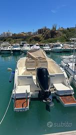 barca motorizzata con Mercury 100cv . Dispone di impianto stereo boss marine , ecoscandaglio Garmin . Impianto luci , doccietta , pompa desentina, parabordi , telo copri motore e pilotina , ancora , 6 giubotti salvataggio , doppia batteria da 100 A, tendalino copri sole , 2 plancette di poppa con scaletta di acciaio