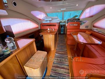 Imbarcazione in ottime condizioni, unico proprietario, solamente 470 ore di moto originali. Imbarcazione con 3 cabine e 2 bagni dotati di box doccia, una matrimoniale a prua + 2 cabine gemelle con letti in piano a centro barca. Cabina marinaio 1 posto letto, attrezzata con servizi e lavatrice. Divani in pelle, calpestio interno tutto in teak con doghe in acero filettato bianco, mobilio in ciliegio. Impianto di aria condizionata in tutti gli ambienti, generatore 9 kw, elica di prua + elica di manovra a poppa, ancora da 20 kg con contacatena, lavaggio catena. Piano cottura induzione 4 fuochi, Lavatrice, Frigorifero sul fly, secondo winch di tonneggio a poppa, seconda autoclave. Telecamera in sala macchine.